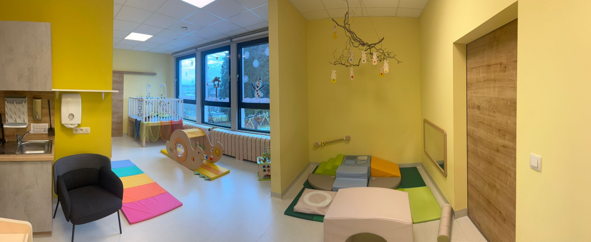 In diesem Gruppenraum finden die Säuglinge ihren Platz. Der Raum beinhaltet folgendes:
